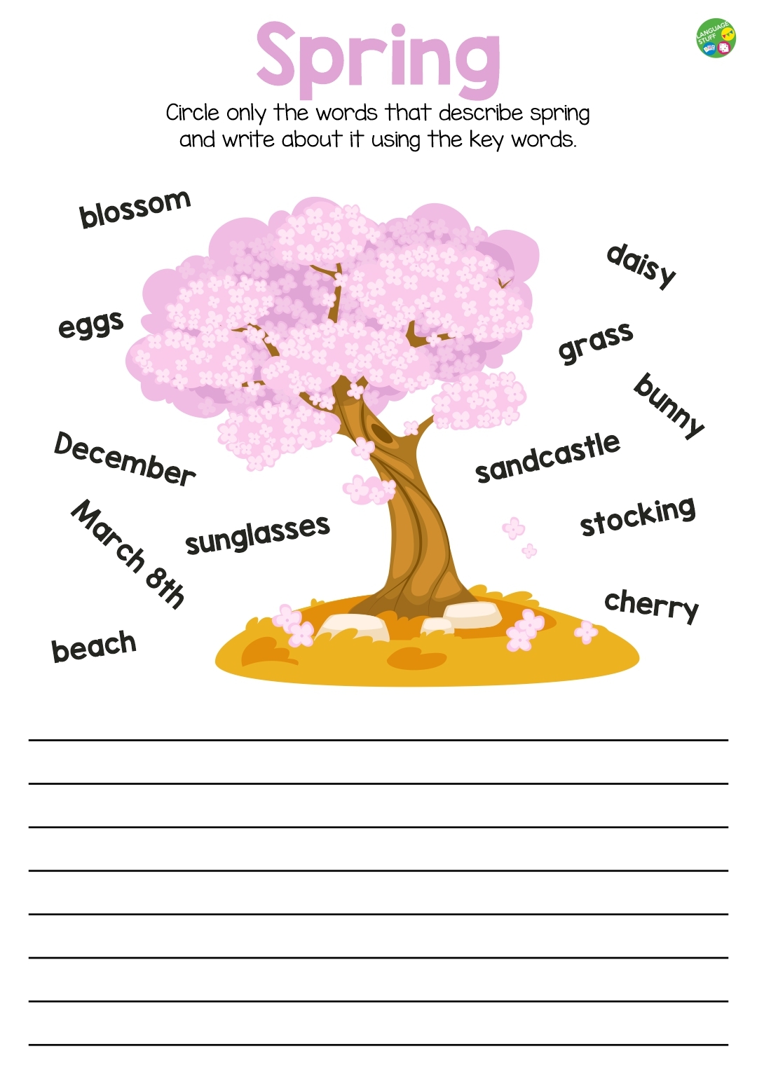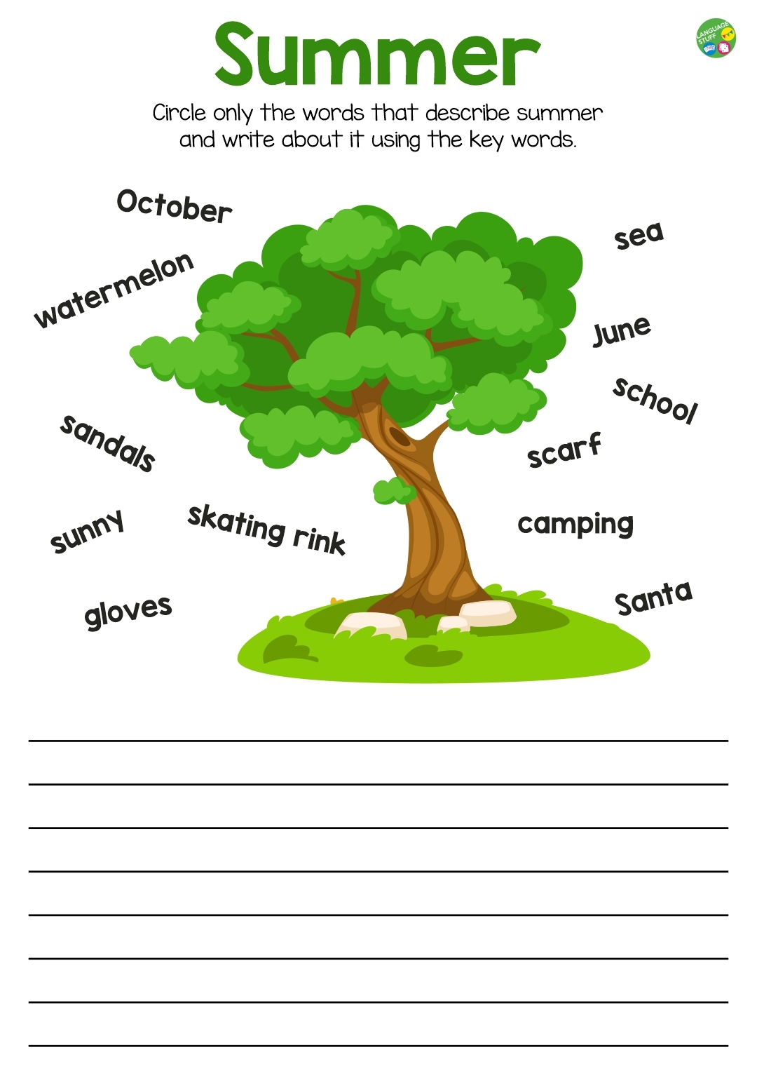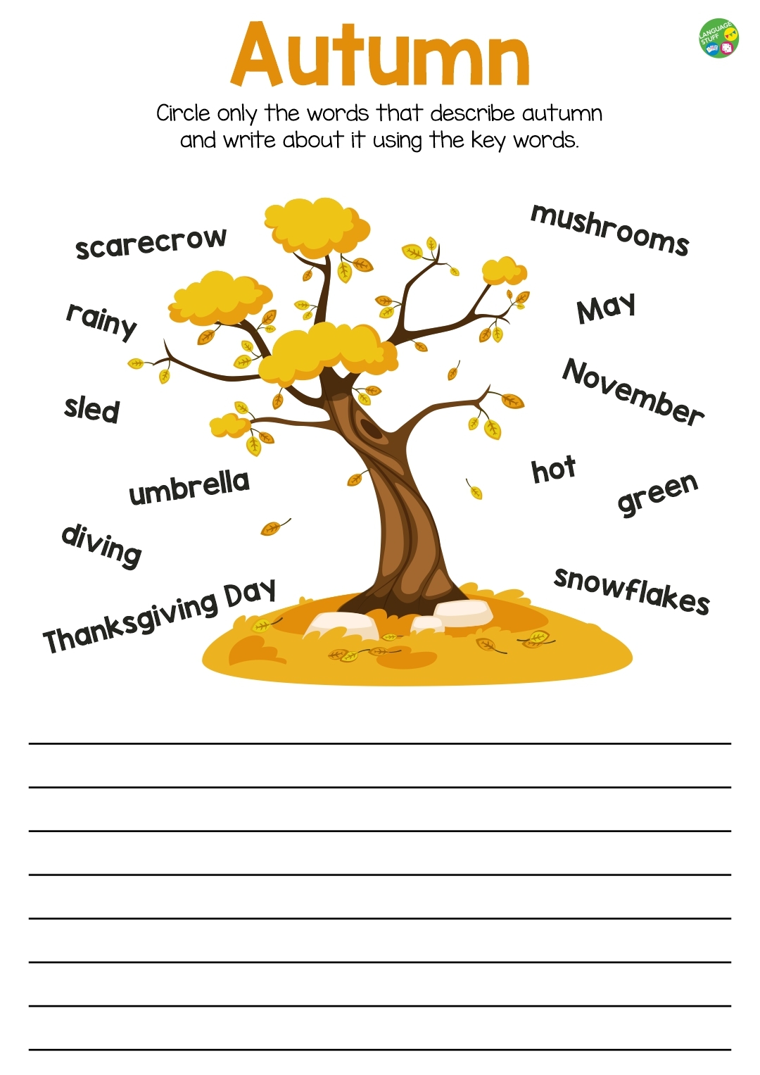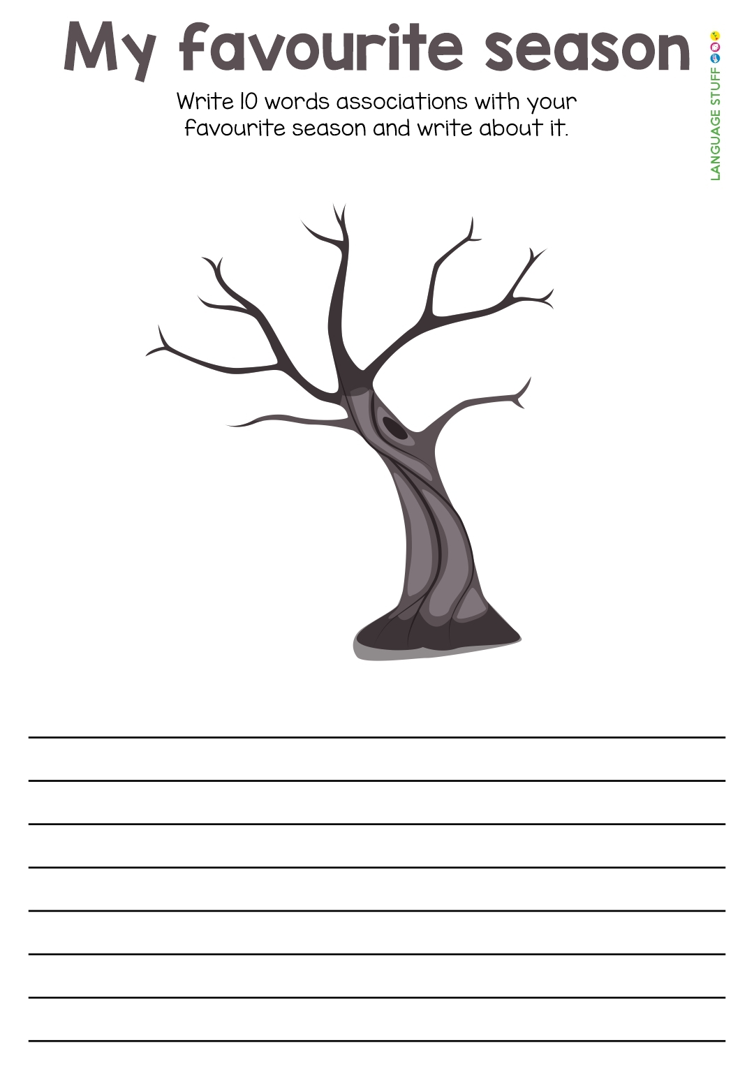 А также файл включает страницу - My favourite season. Ребята дорисовывают и раскрашивают дерево в соответствии с любимой частью года, затем пишут слова, которые они с ней связывают, и составляют короткую историю или текст, используя свою ключевую лексику.